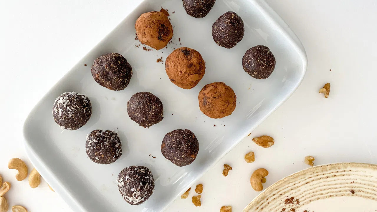 Opção de docinho saudável, adoçado de forma natural com tâmaras. Feito apenas com tâmaras, cacau e castanhas variadas, este docinho serve para o dia a dia ou para receber amigos e familiares em casa.