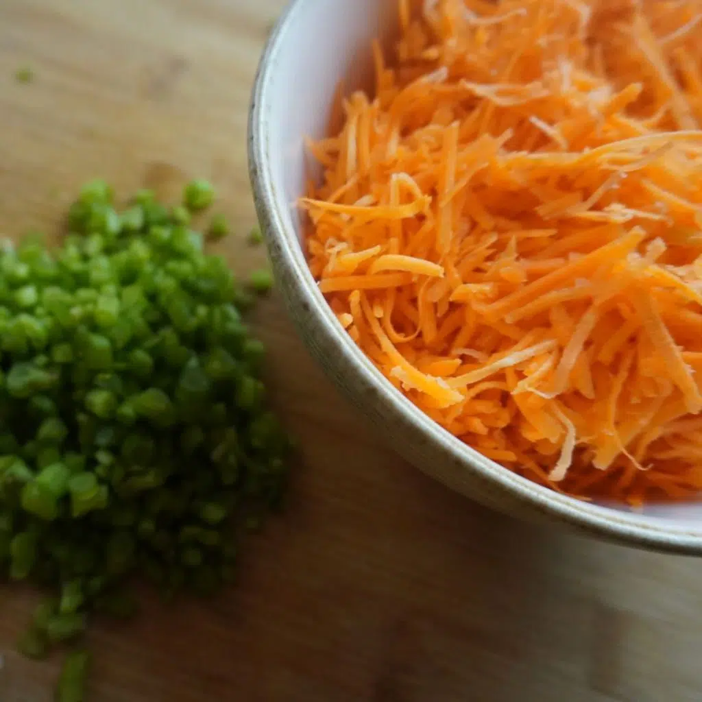 1. Pique a cebola em cubos e o alho bem pequeno. Leve uma chaleira com água para ferver enquanto rala a cenoura e corta os talos de espinafre bem pequeno.