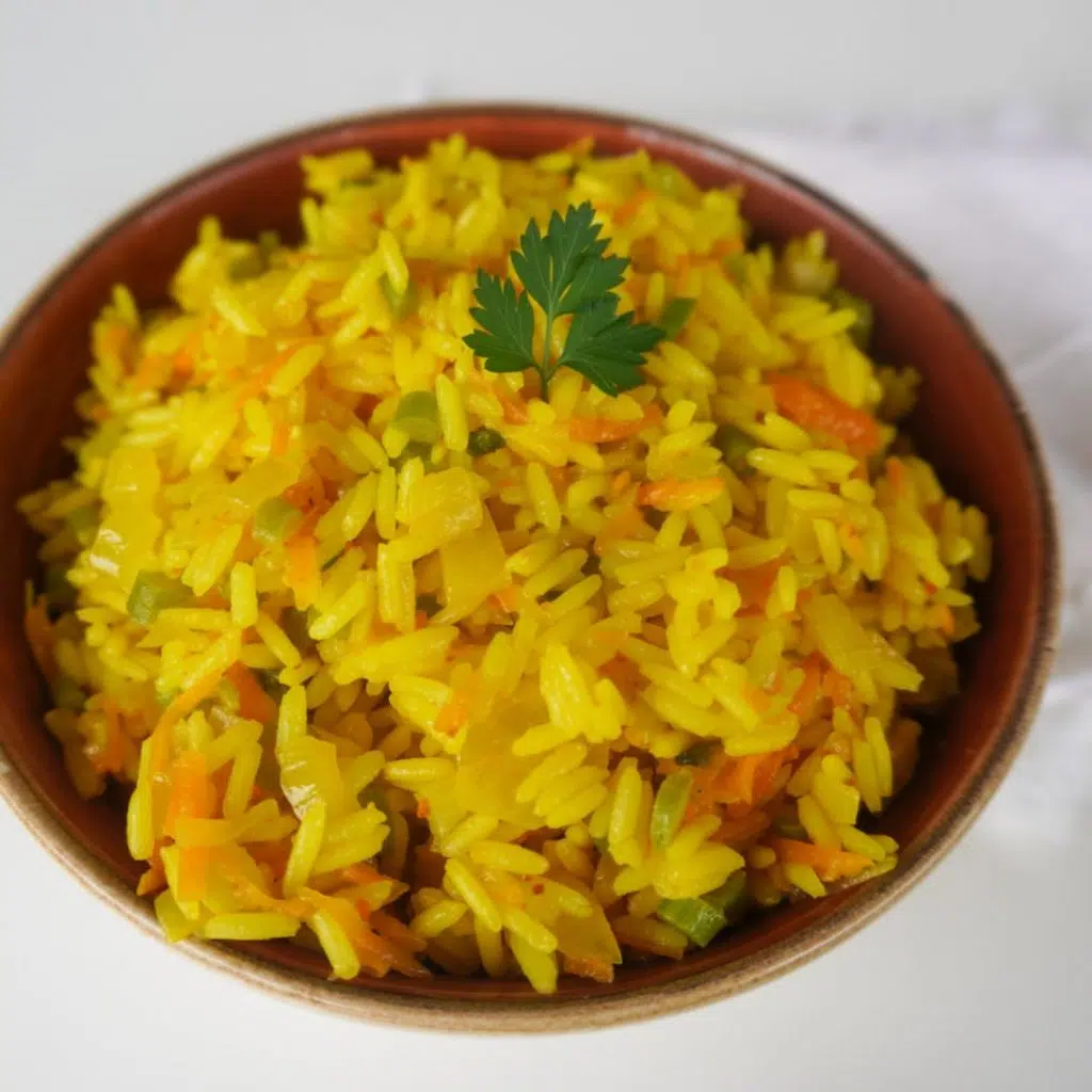 Arroz branco: vamos usar o arroz branco para este prato. Prefira a variedade agulhinha, que tem grãos longos e fica mais soltinho. Você pode fazer a receita usando arroz integral, mas a cor e apresentação ficará diferente.