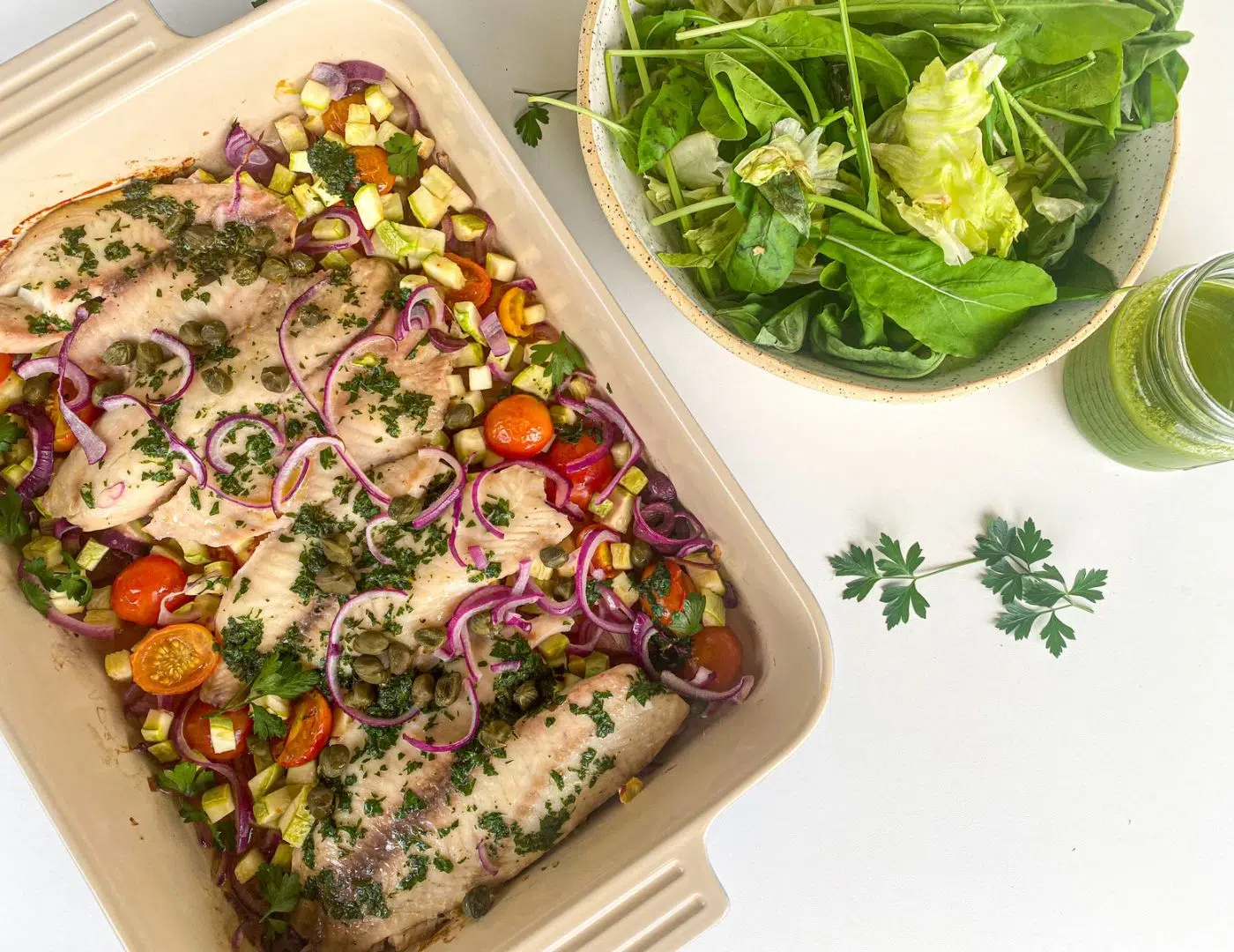 Nesta tilápia assada vamos forrar a assadeira com vegetais como abobrinha, tomatinhos e cebolas. Sobre eles, vai a tilápia. O segredo é a manteiga temperada com ervas (salsinha) e que deixa o prato delicioso e alguns elementos interessantes como azeitona e alcaparras.