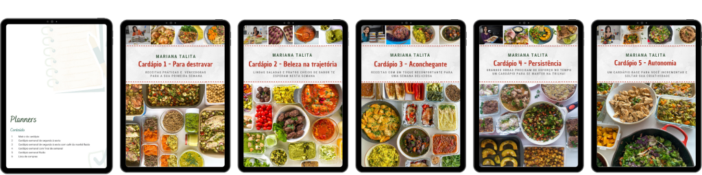 Coletânea Saudável no dia a dia: Aqui você encontra as minhas melhores receitas para o dia a dia – em formato de cardápio semanal. Assadeiras com vegetais, pratos únicos, molhos, pastinhas, temperos, pratos com vegetais, ensopados e preparos bases e pratos que ficam prontos em menos de 15 minutos.