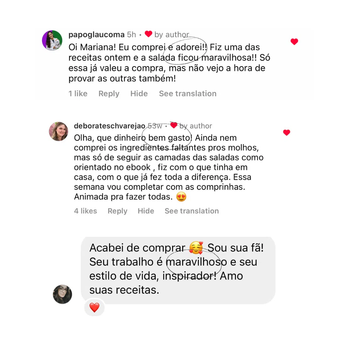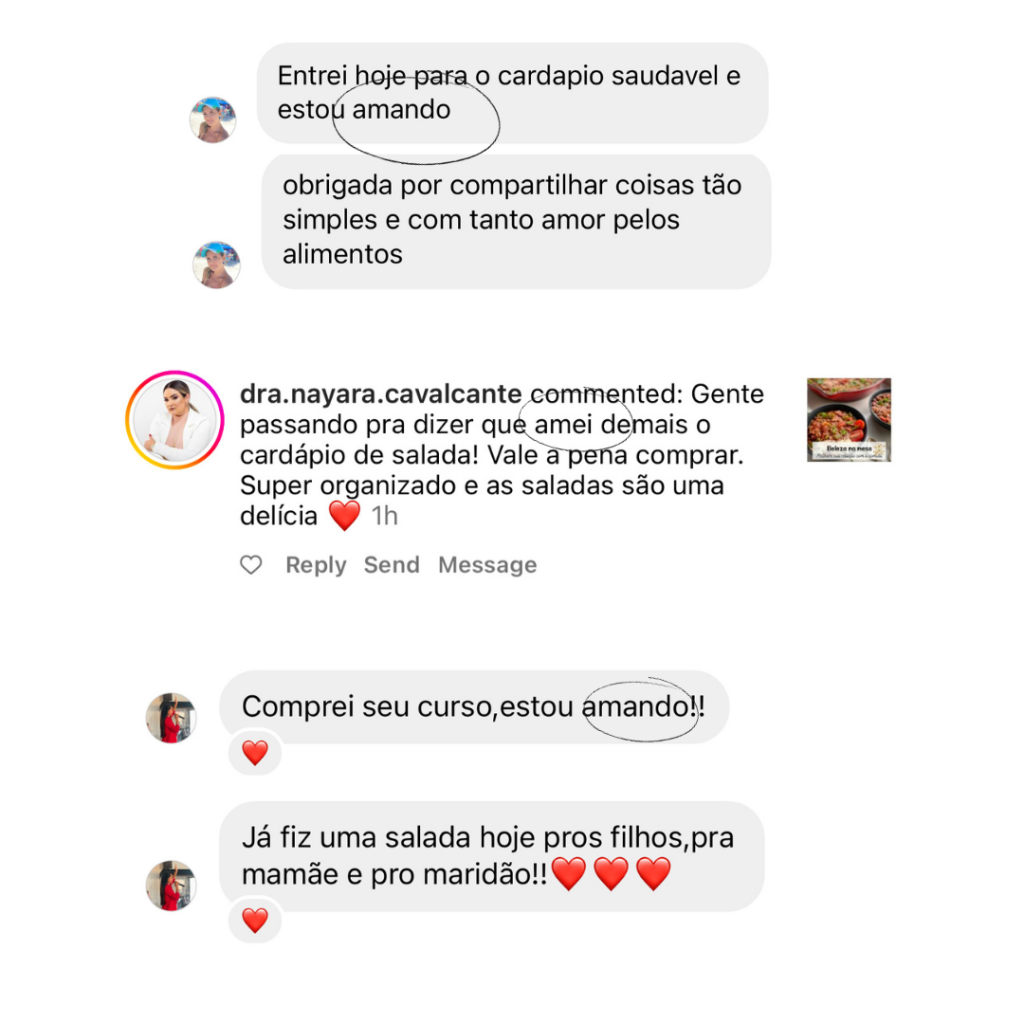 Atualmente tenho 4 e-books disponíveis no meu site e a coletânea “Saudável no dia a dia”. Diariamente recebo mensagens de mulheres e alunas que colocaram minhas orientações e receitas na prática e surpreenderam familiares e amigos com o sabor que a comida saudável pode ter.