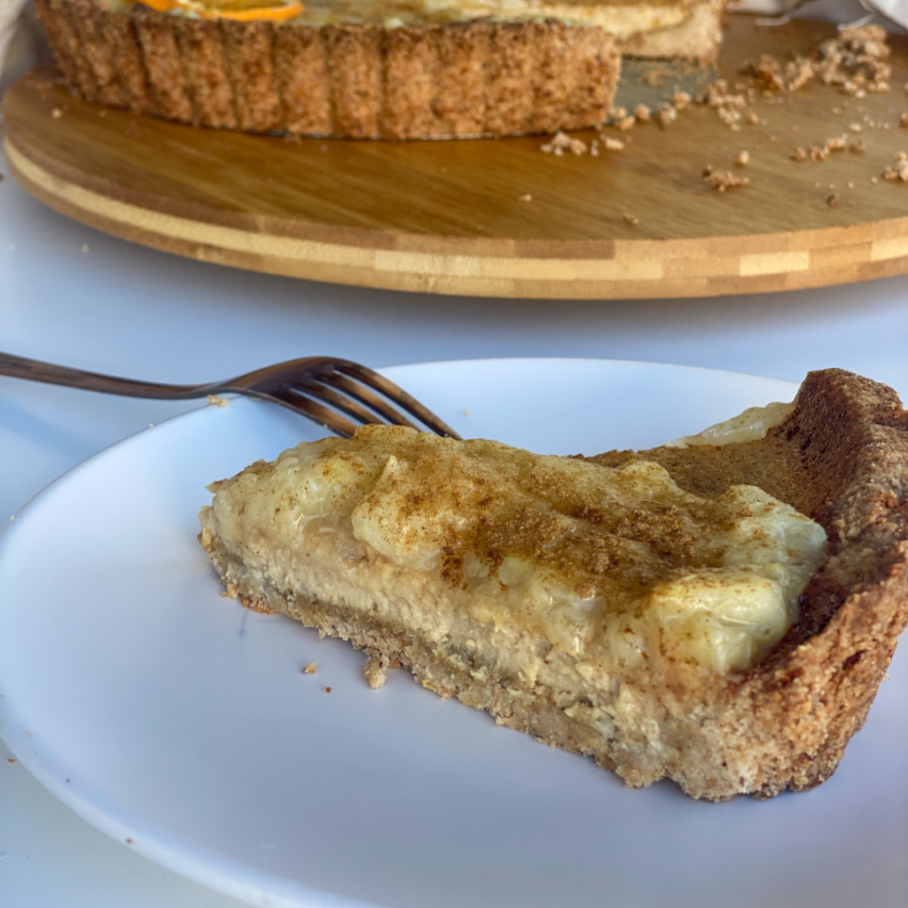 Torta de laranja e pêssegos, base de castanhas.