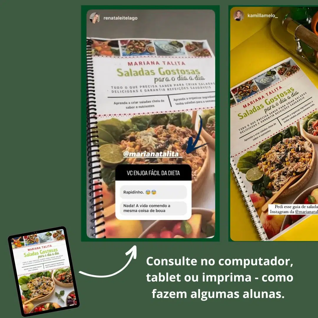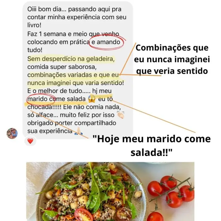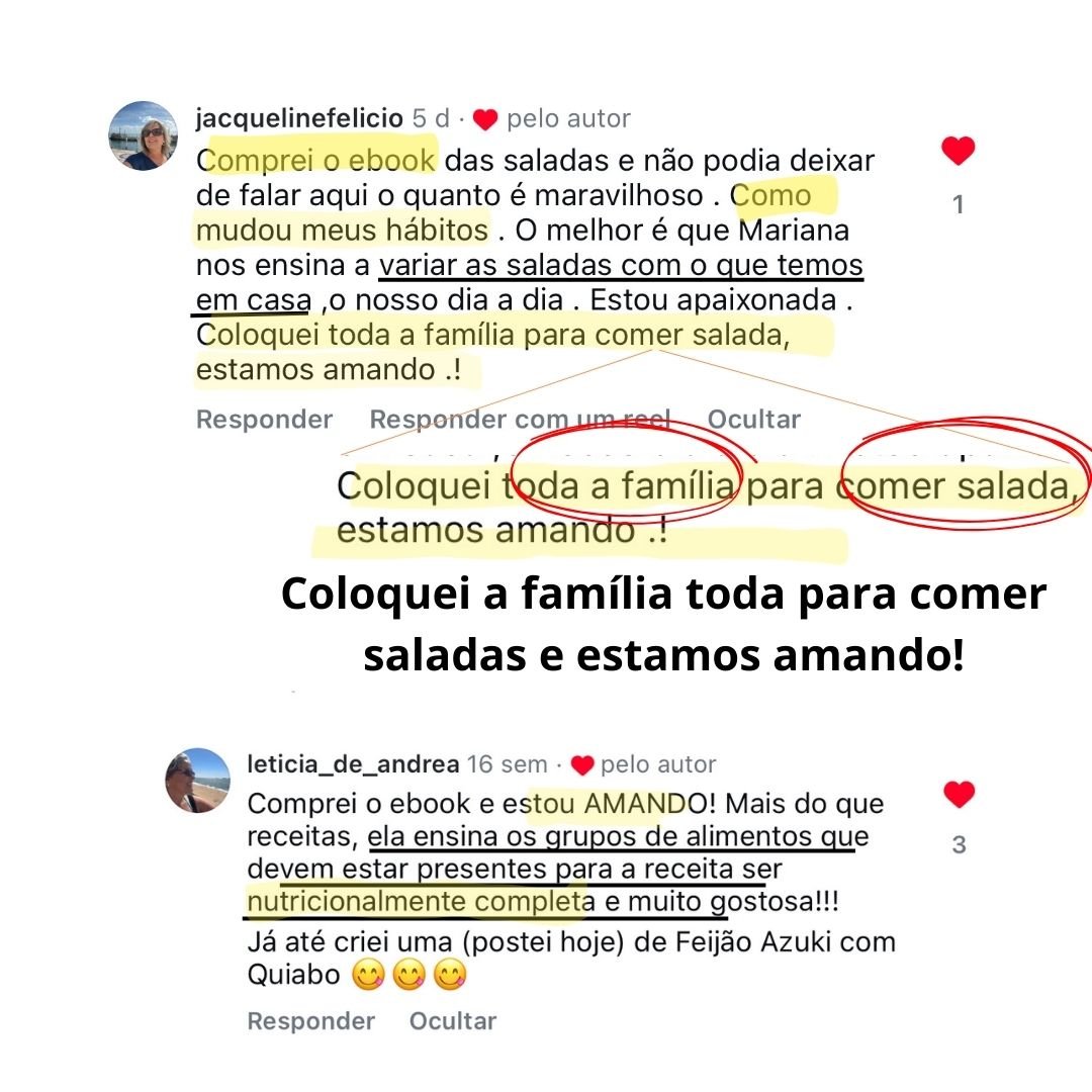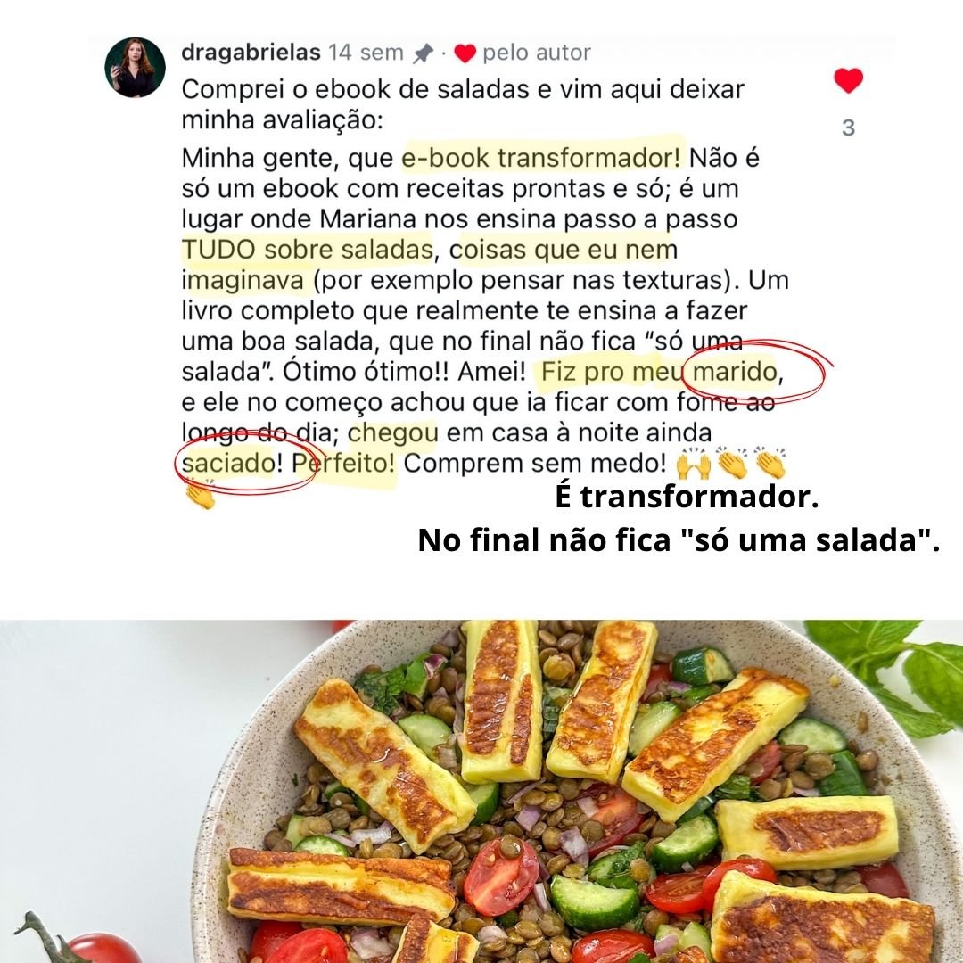 A grande maioria das receitas pode ser feita com substituições e logo na primeira parte do e-book você vai aprender o método “camada a camada” que te ensina a substituir ingredientes caso não encontre algum. – Com o e-book é natural ganhar autonomia e confiança para criar saladas gostosas com o que tem em mãos.
