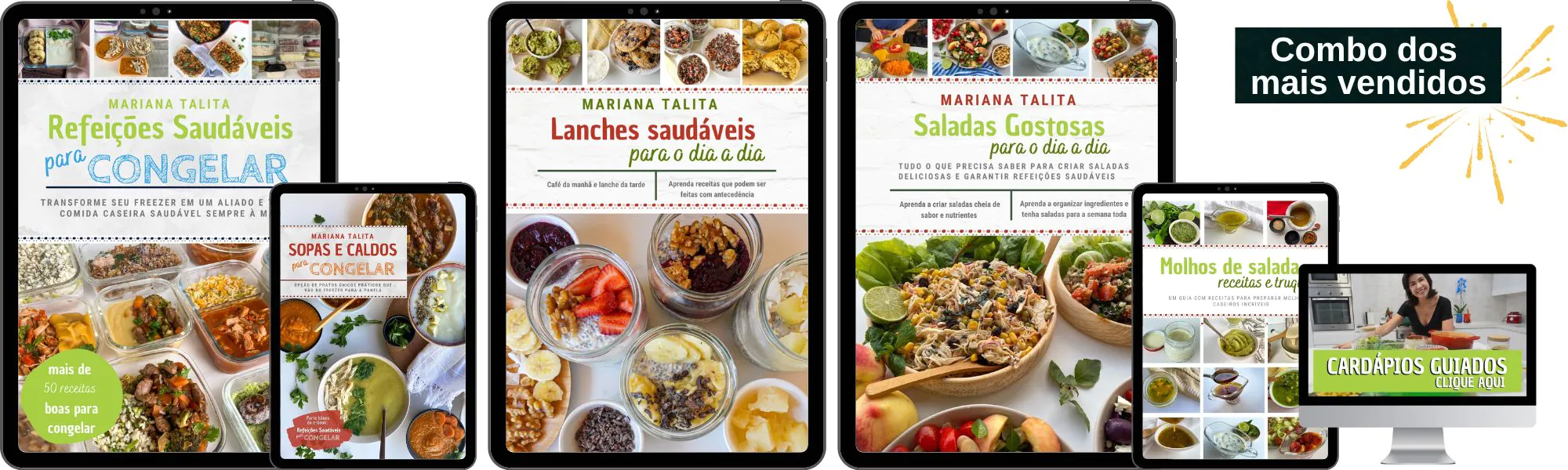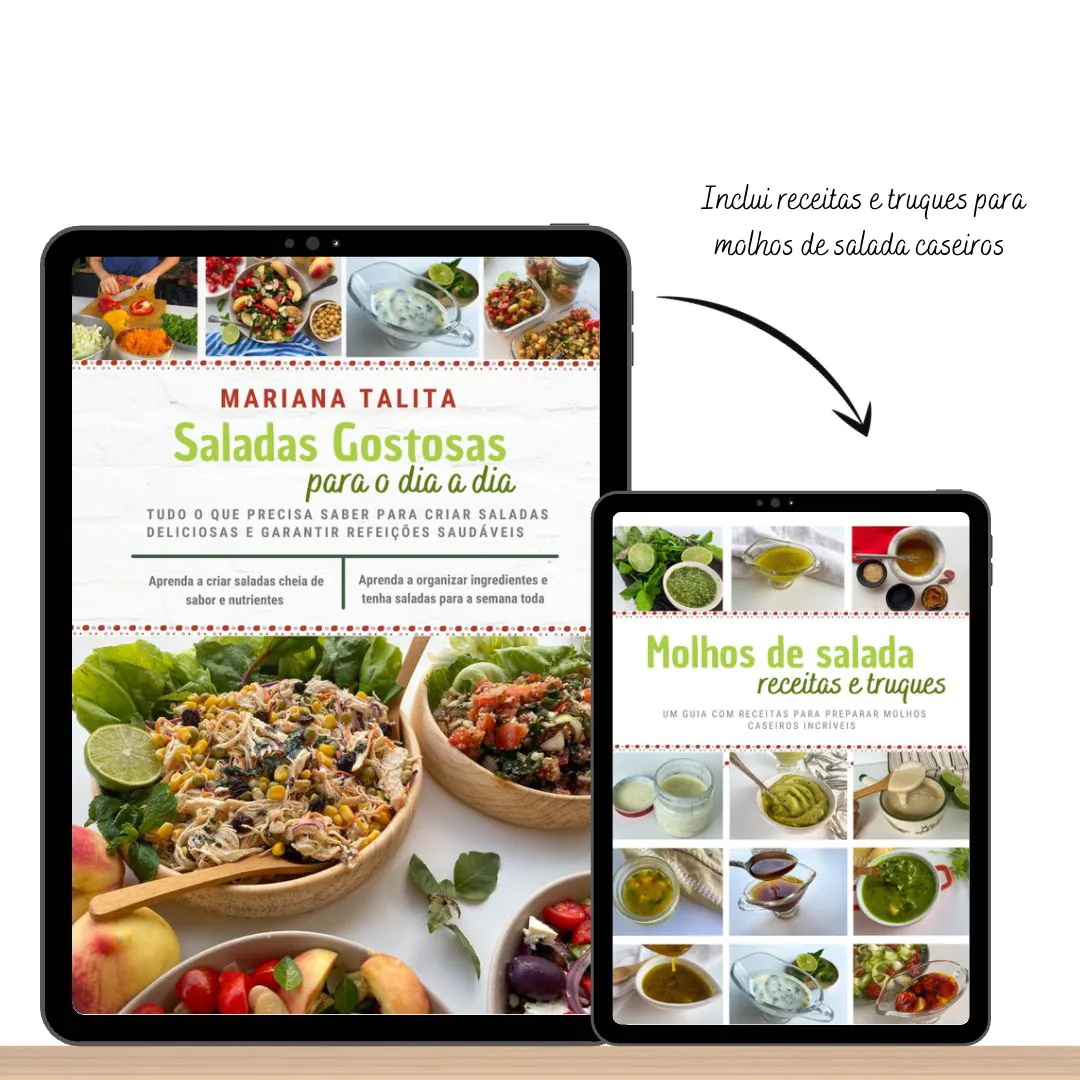 Toda a metodologia está explicada no e-book Saladas Gostosas para o dia a dia, que inclui mais de 70 receitas de saladas e 20 receitas de molhos. Você poderá baixar o livro digital, e ele será seu para sempre. Poderá ver no celular, tablet, computador ou imprimir.