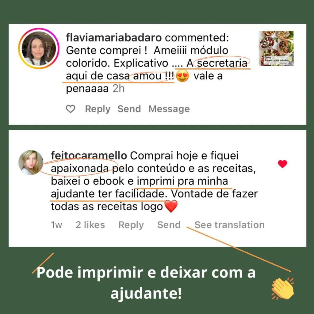 Você só precisará baixar uma vez e o material passa a ser seu para sempre, no seu computador ou celular. O e-book também pode ser impresso – muitas clientes imprimem e encadernam.