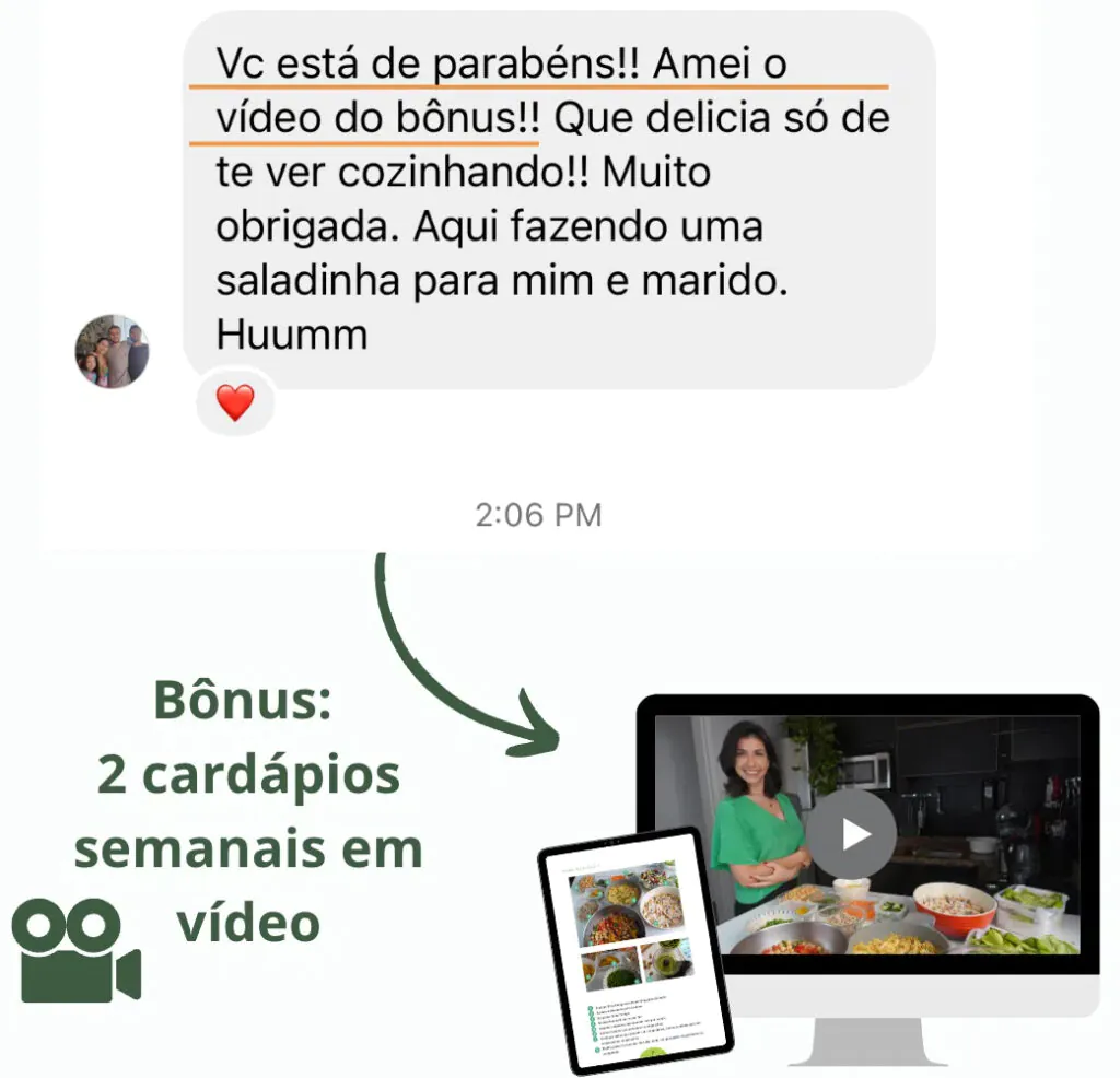 Além do e-book você tem acesso à cardápios completos com lista de compras e plano de ataque em vídeo:
