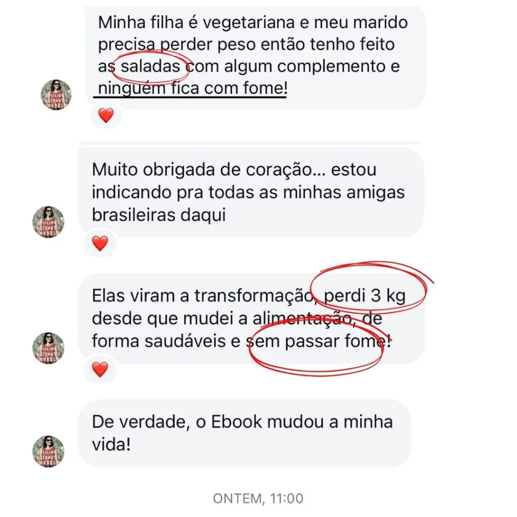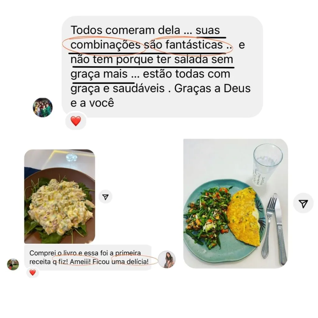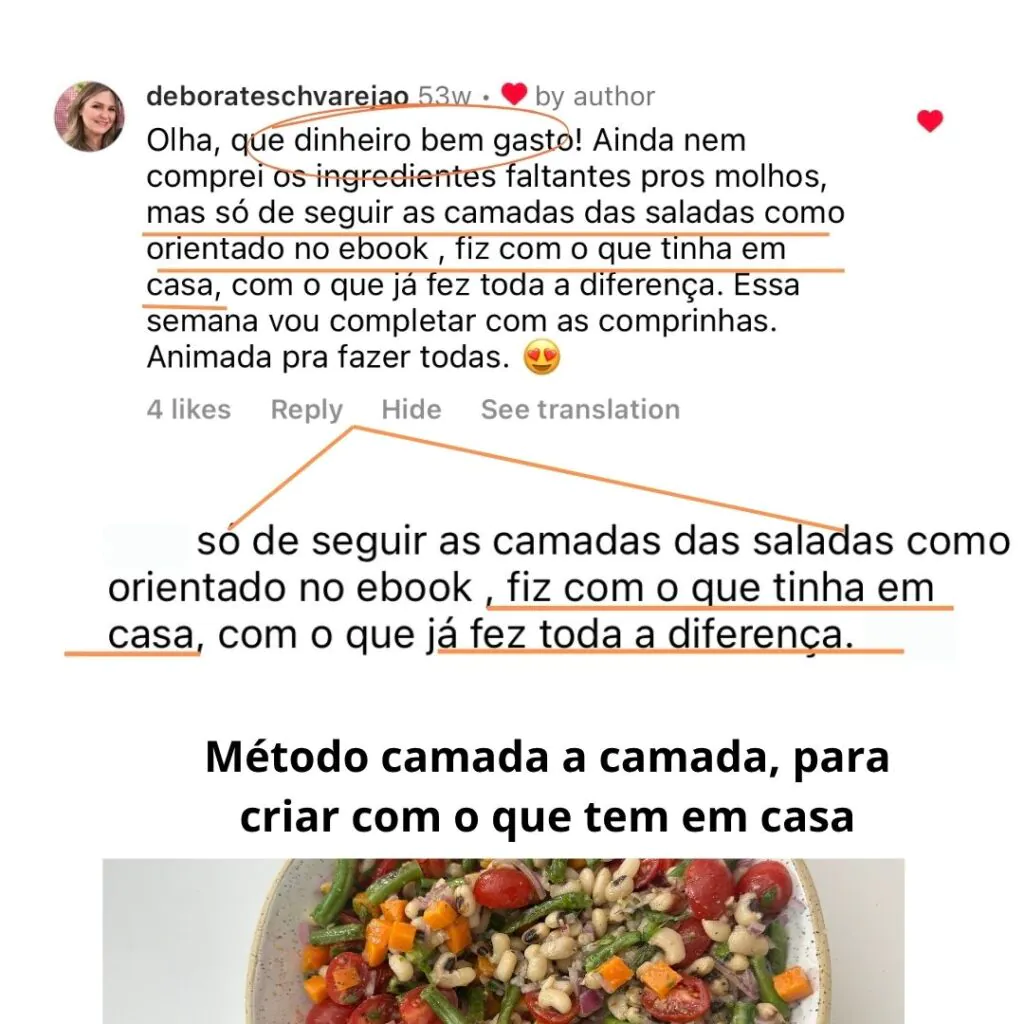 Jackeline conta como mudou sua visão sobre saladas e passou a variar mais a alimentação com o e-book. “Aí eu coloquei simplesmente a família inteira para comer salada e está todo mundo adorando!”